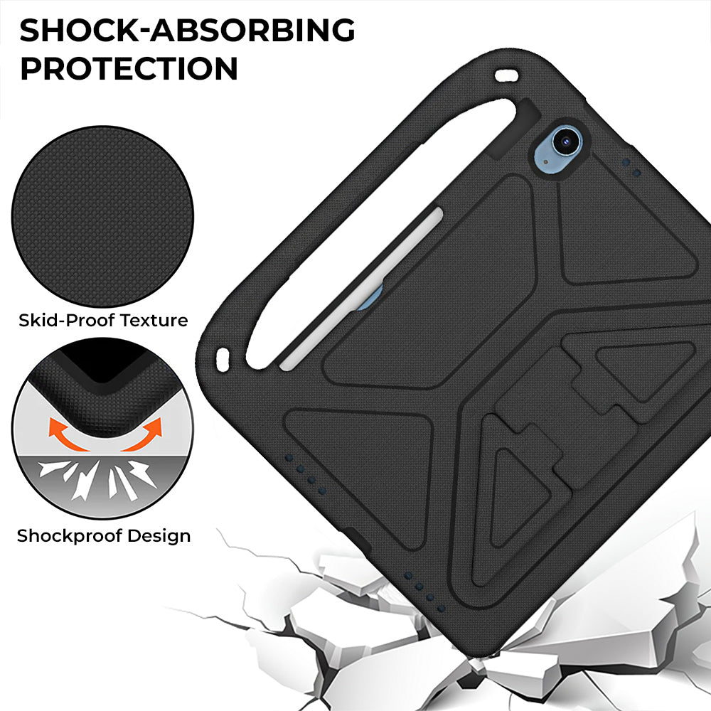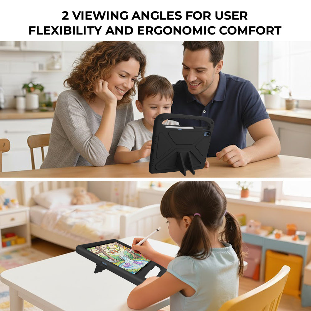 This easy to clean kid proof protective case is specifically designed for the iPad 10th Gen 10.9" 2022/11th Gen 11" 2025. Made from lightweight and durable EVA foam, it is ideal for providing maximum protection for your tablet. With an easy-grip, comfortable handle, you're able to carry your tablet from one place to another making it extremely portable. This case is water resistant (spills bead up rather than soaking in) and repels lint/dust making it easy to use. The in-built stand will allow you to prop the device anywhere it's convenient for you. Bonus feature: the case offers 2 viewing styles and can accommodate multiple students/viewers from both angles with a single tablet in a classroom or home school setting.
